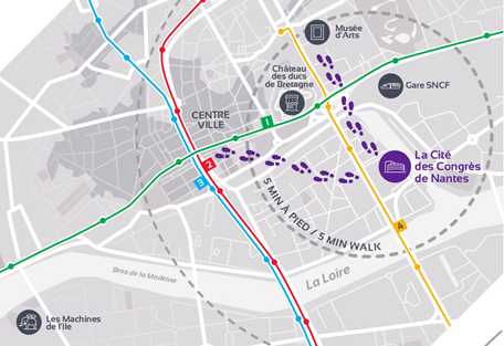La Cité des Congrès is directly connected to busway line 4 at the “Cité des Congrès” station. It is also a 5-minute walk from tramway line 1 at the “Duchesse Anne-Château” station, and a 10-minute walk from lines 2 and 3 at the “Hotel Dieu” and “Aimé Delrue” stations. You can find more information here.
